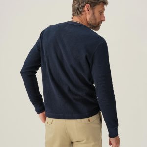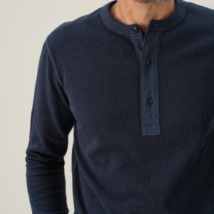 Classic fit thermal long sleeve henley with a straight hem. This 250 GSM French rib cotton double knit features a waffle-knit face and a smooth jersey back. Details include a woven three-button placket and corozo buttons. Constructed with ribbed cuffs and flat-lock stitching throughout for improved comfort and durability. Garment washed with enzymes and softener for a lived-in feel.
