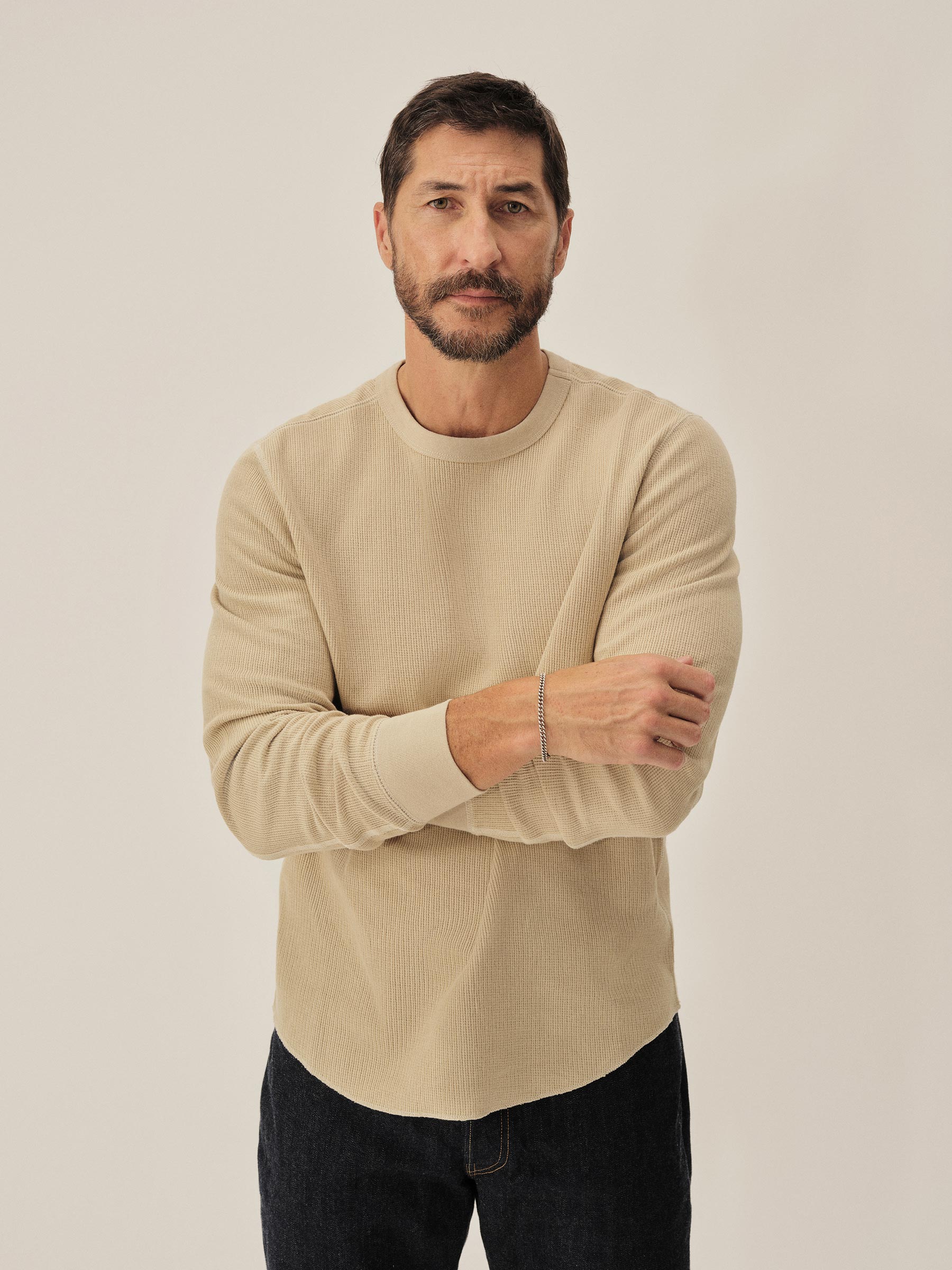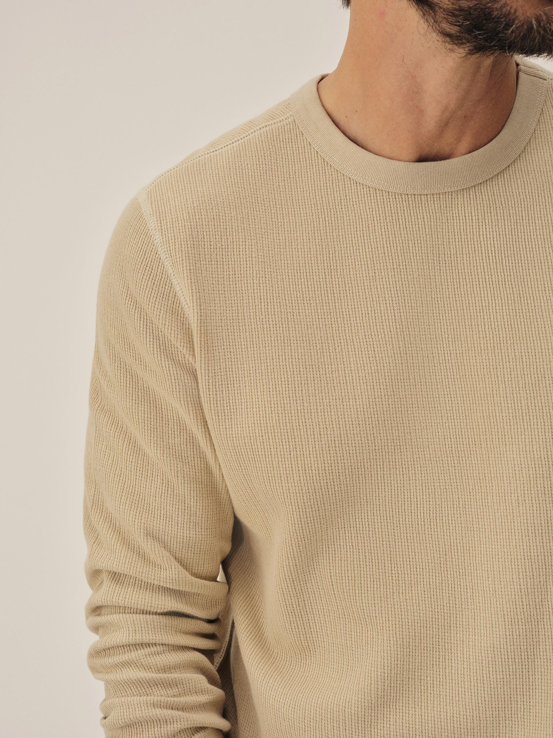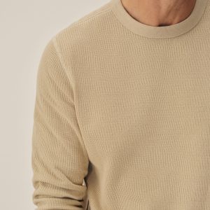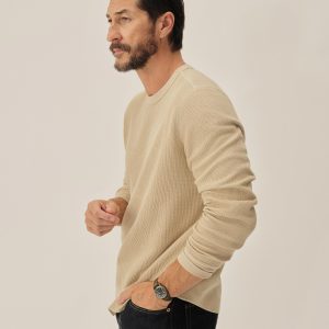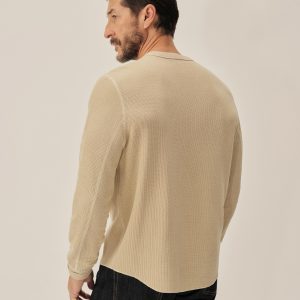 Classic fit thermal long sleeve crewneck tee with our signature curved hem. This 250 GSM French rib cotton double knit features a waffle-knit face and a smooth jersey back. Constructed with ribbed cuffs and flat-lock stitching throughout for improved comfort and durability. Garment washed with enzymes and softener for a lived-in feel.