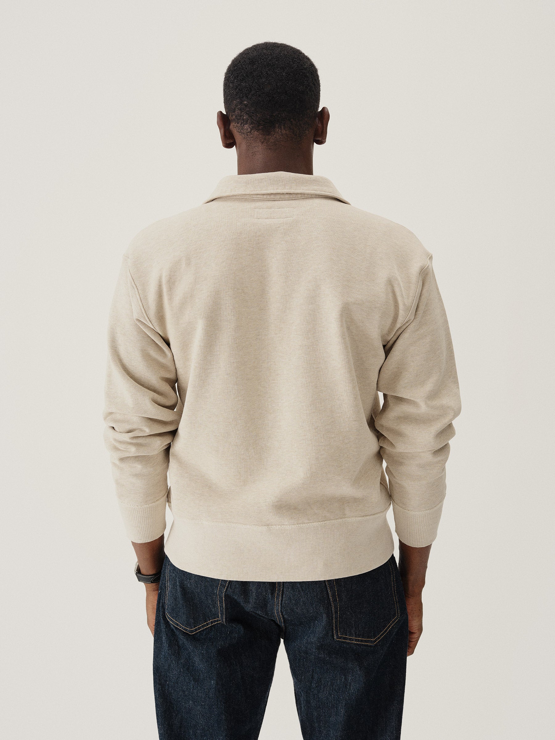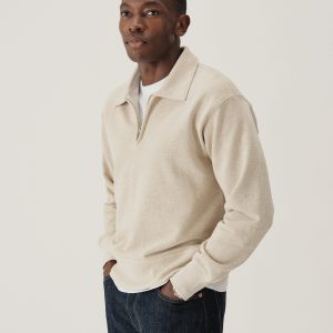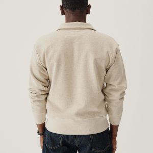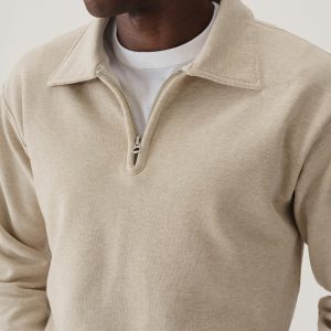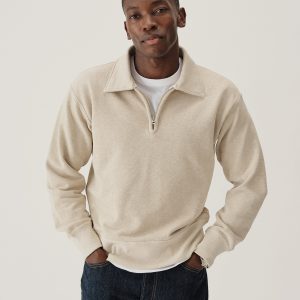 A midcentury-inspired quarter-zip collared sweatshirt made from plush, not-too-heavy, not-too-light, welterweight French terry. Features a foldover collar and front zip closure.