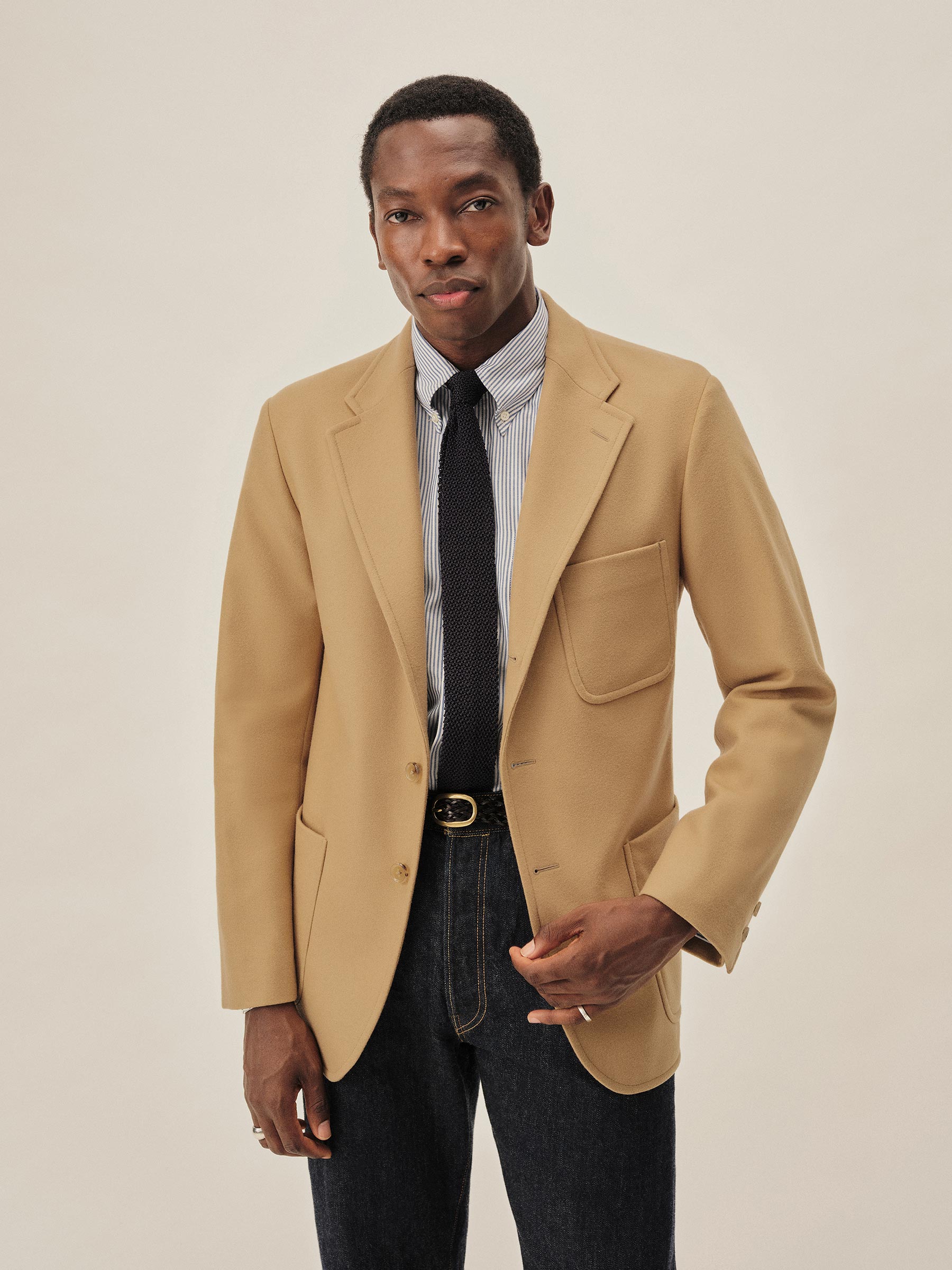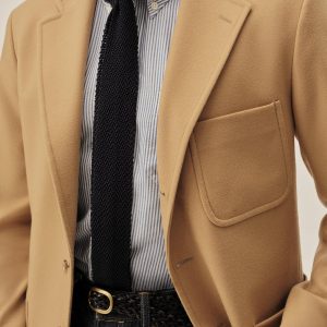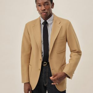 An Ivy-inspired American blazer crafted from a blend of wool and cashmere. Designed with a 3-roll-2 button stance, open patch pockets, and a functional sleeve vent with two horn buttons. Cut with a center back seam and left unlined through the body for a relaxed, unstructured feel, while the sleeves are fully lined in viscose for smooth layering.