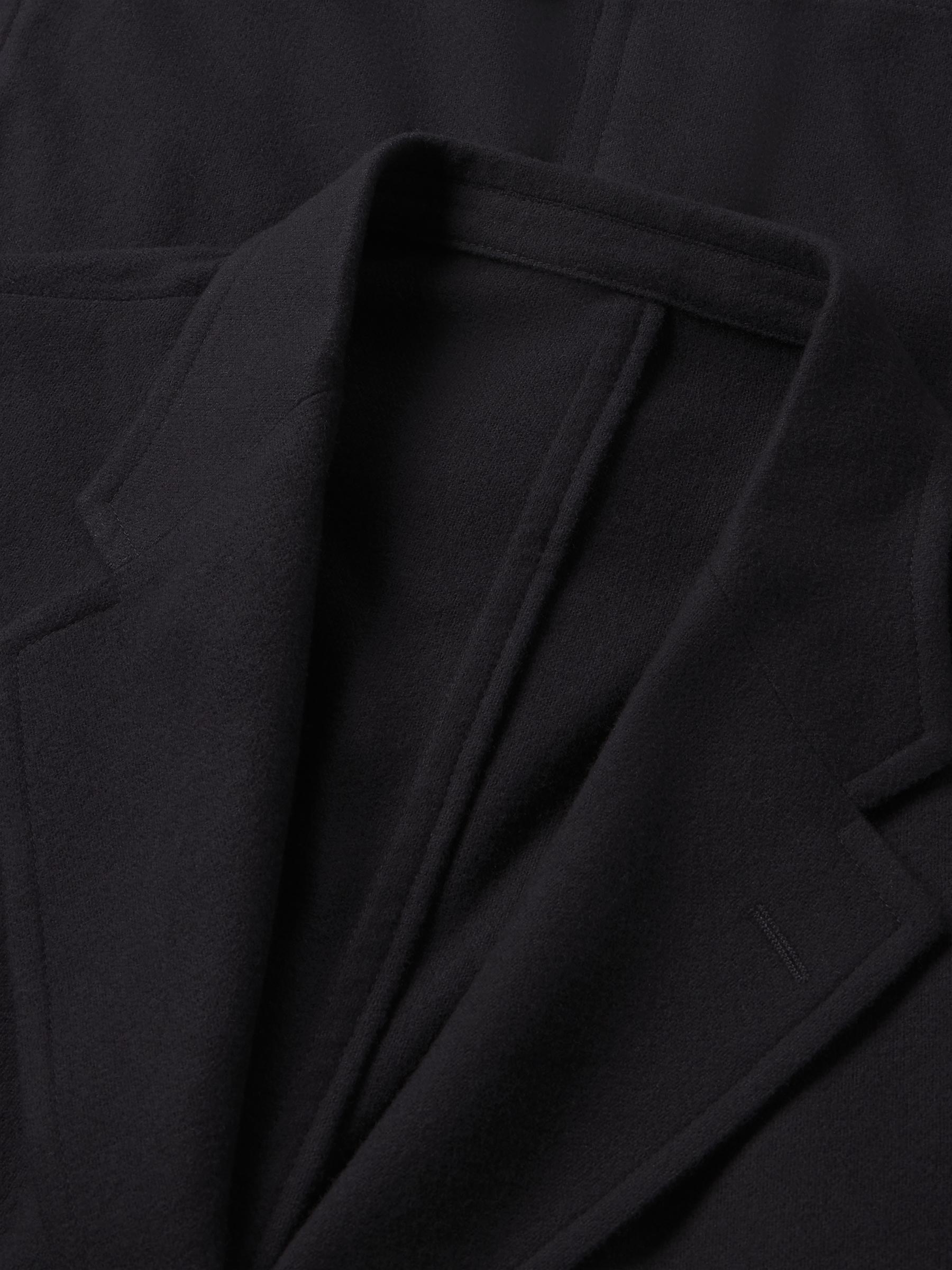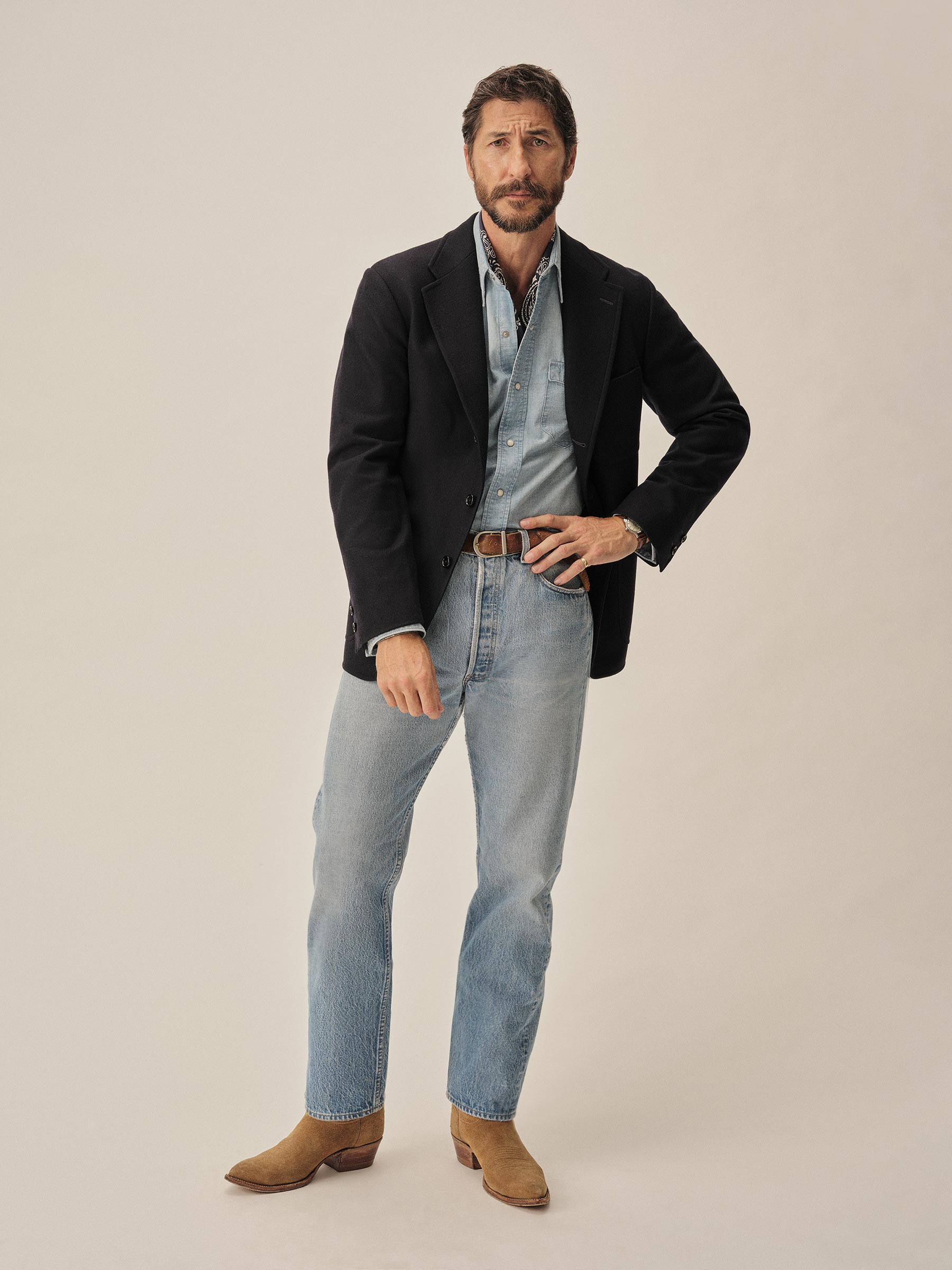 An Ivy-inspired American blazer crafted from a blend of wool and cashmere. Designed with a 3-roll-2 button stance, open patch pockets, and a functional sleeve vent with two horn buttons. Cut with a center back seam and left unlined through the body for a relaxed, unstructured feel, while the sleeves are fully lined in viscose for smooth layering.