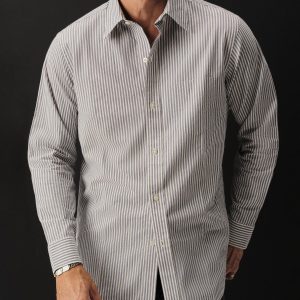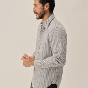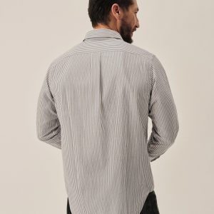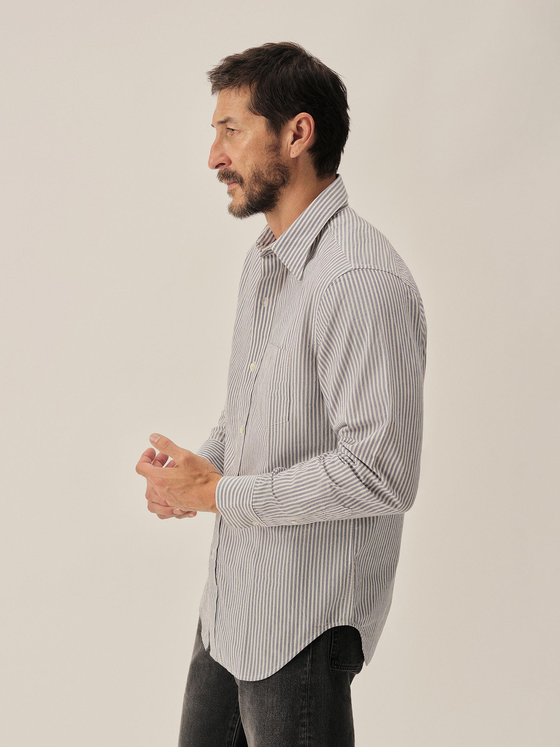 Slim fit long sleeve button-up cut from 4 oz. washed cotton. Details include a button placket, a single spade pocket at the chest, and a box pleat at the back yoke. Constructed with single needle topstitch detailing with double needle stitching at the collar and cuffs.