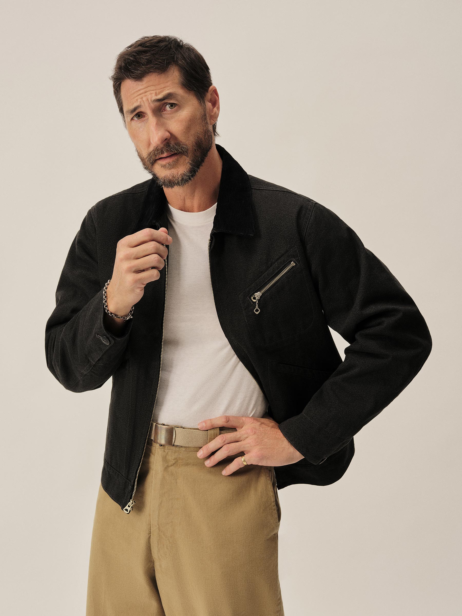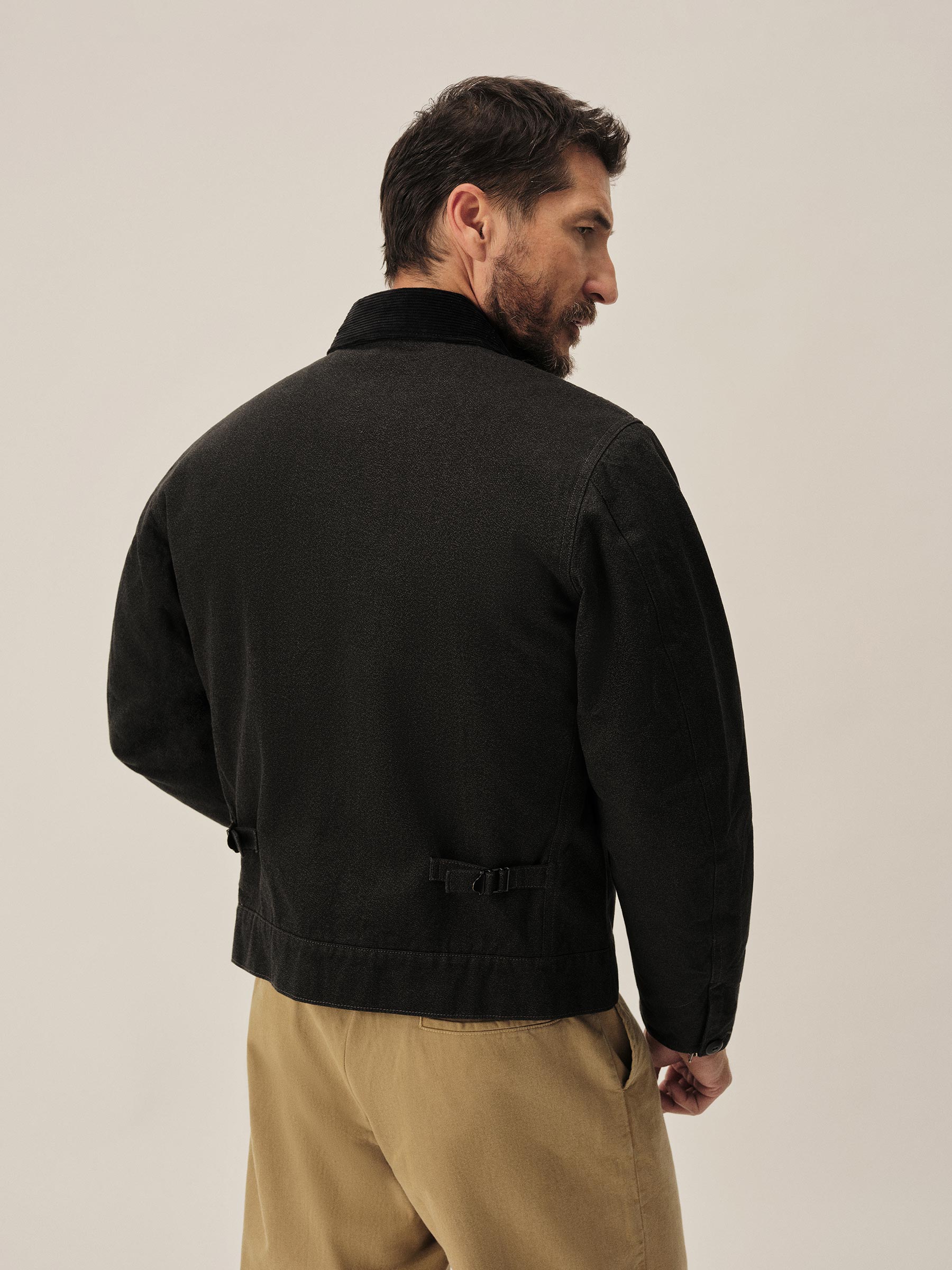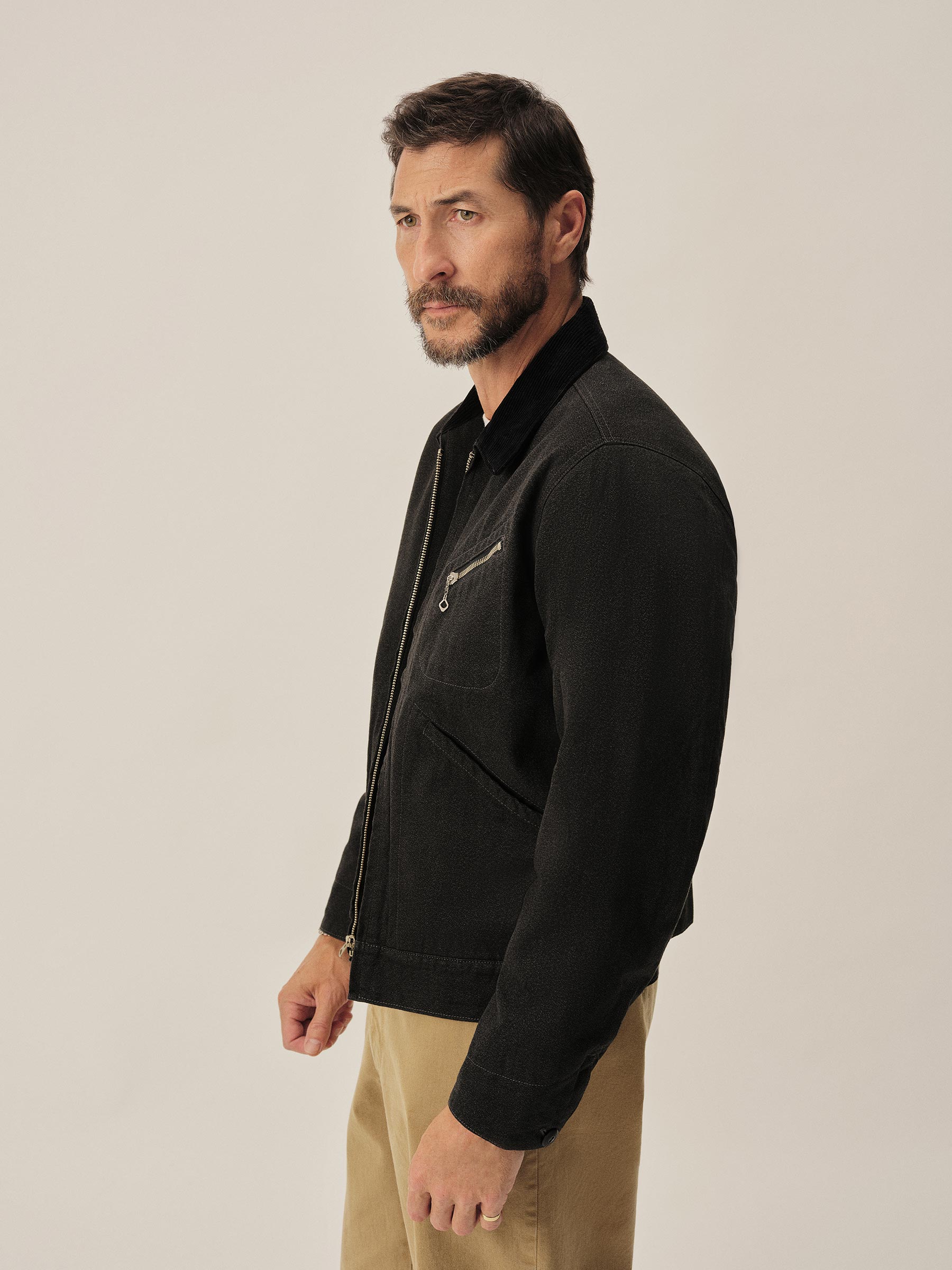 Based on a 1940s work jacket, the Wyatt is cut from Japan-milled jaspe twill, with twisted yarns woven for a subtle heathered finish. The body is lined in cotton-wool herringbone for warmth, while the sleeves have a smooth brushed satin lining for easy layering. A corduroy top collar and face cuffs, Japanese Universal zipper at the chest pocket, stitched-through welt hand pockets, and reproduction corozo buttons complete the design, along with workwear-style cuffs and adjustable metal side cinches at the back.